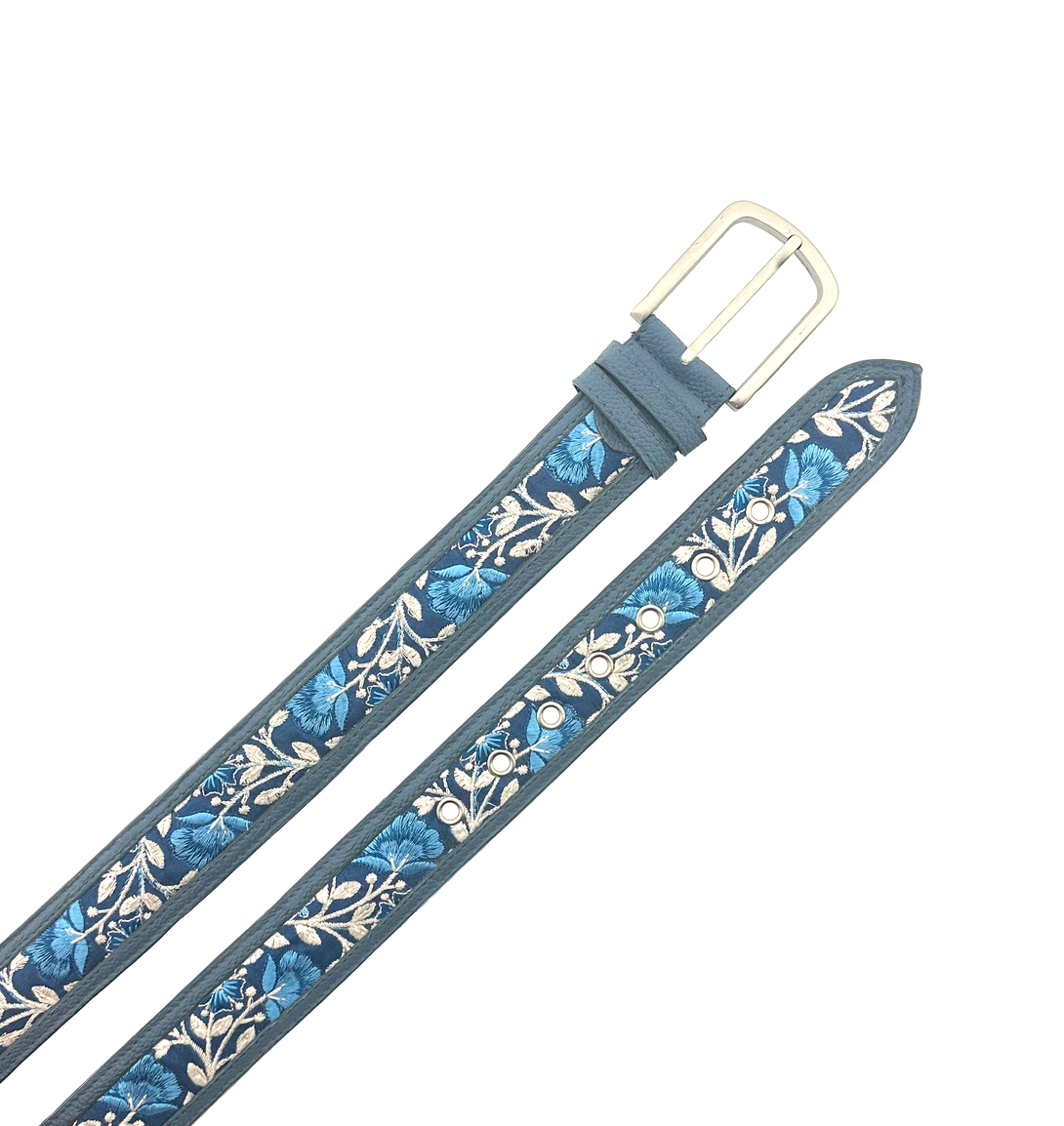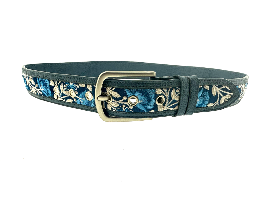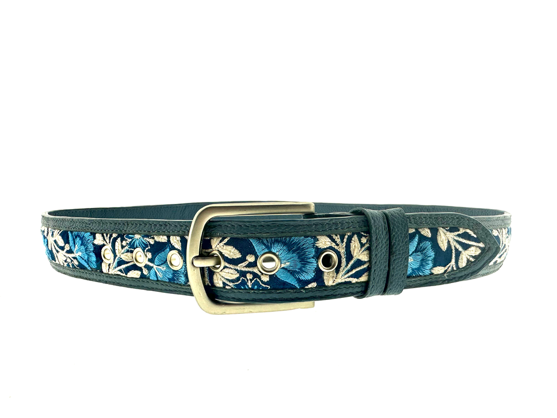 Deze turquoise leren riem met wit en turquoise geborduurde bloemen met een zichtbare leren rand is de perfecte keuze om je outfit te accentueren. Of je nu een vleugje elegantie aan je dagelijkse look wilt toevoegen of een subtiel statement wilt maken, deze riem is veelzijdig en stijlvol.